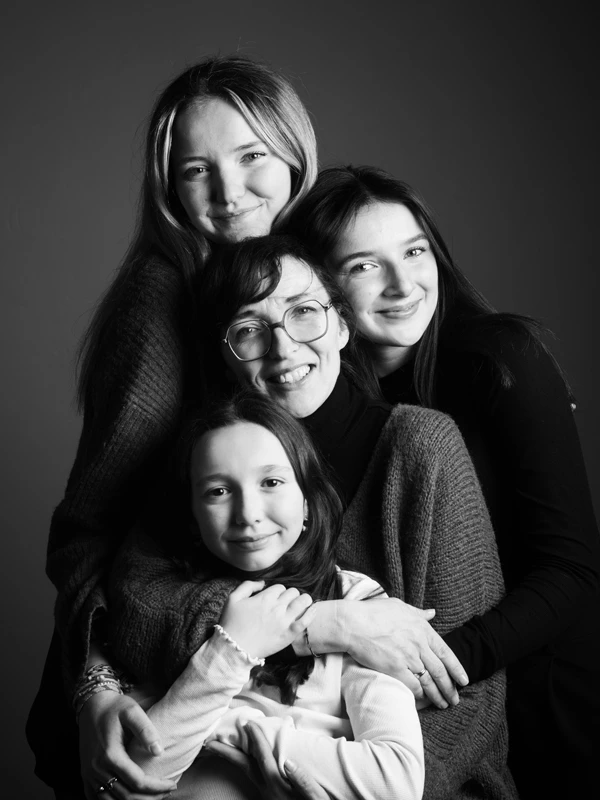 Ensuite, nous réalisons la séance l’après-midi dans un studio calme et entièrement privatisé. Je vous accompagne pas à pas pour organiser la place de chacun, afin de créer une image d’ensemble cohérente et vivante.